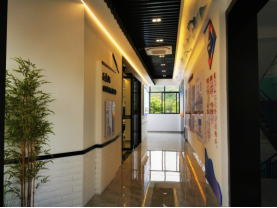 (二)入口展示:经过文化走廊区穿过玻璃门进入基地,正前方为专家讲座区,左边为金融消保区,可向左转开始基地参观、学习。