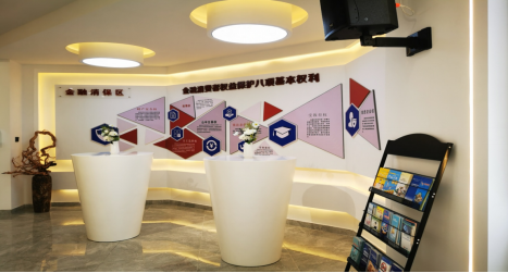 (四)金融消保区:整面定制广告造型,以白+红+蓝的颜色呈现,暗藏灯带,介绍金融消费者八项基本权利:财产安全权、知情权、自主选择权、公平交易权、依法求偿权、受尊重权、受教育权、信息安全权。