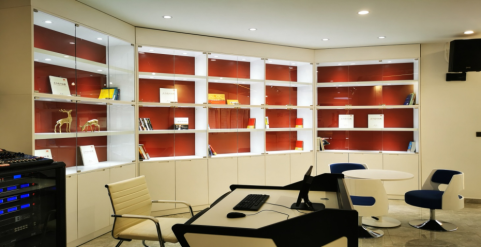 (六)互动交流/意见征集区:整面定制柜体,以白+红的颜色呈现,用于展示相关金融物品,例如宣传手册、金融书籍等。同时放置沙发用于讨论交流,提出意见及建议。